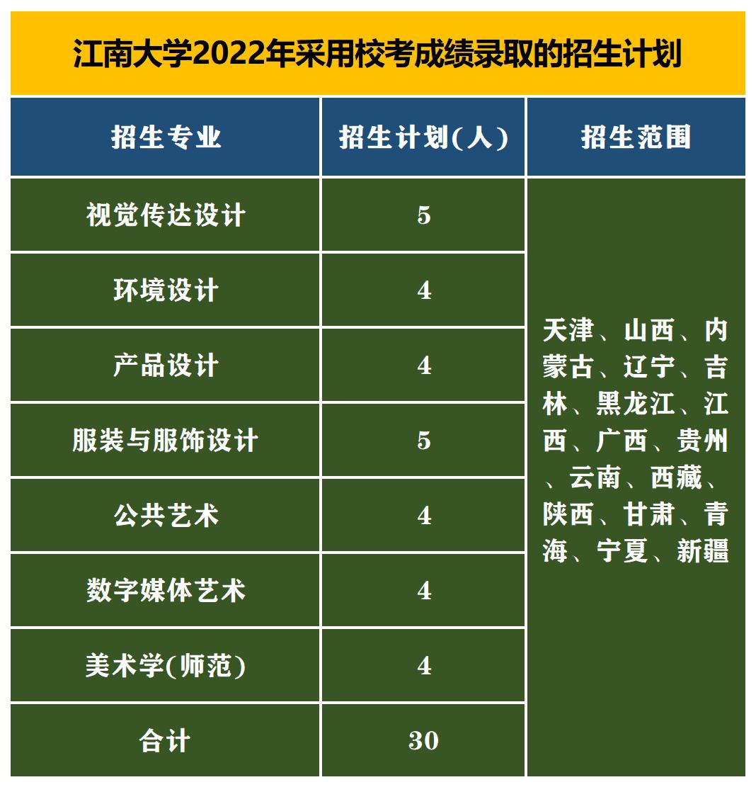 2022年江南大学美术与设计类专业采取校考成绩录取,面向天津、山西、内蒙古、辽宁、吉林、黑龙江、江西、广西、贵州、云南、西藏、陕西、甘肃、青海、宁夏、新疆招生30人具体招生计划见下表: