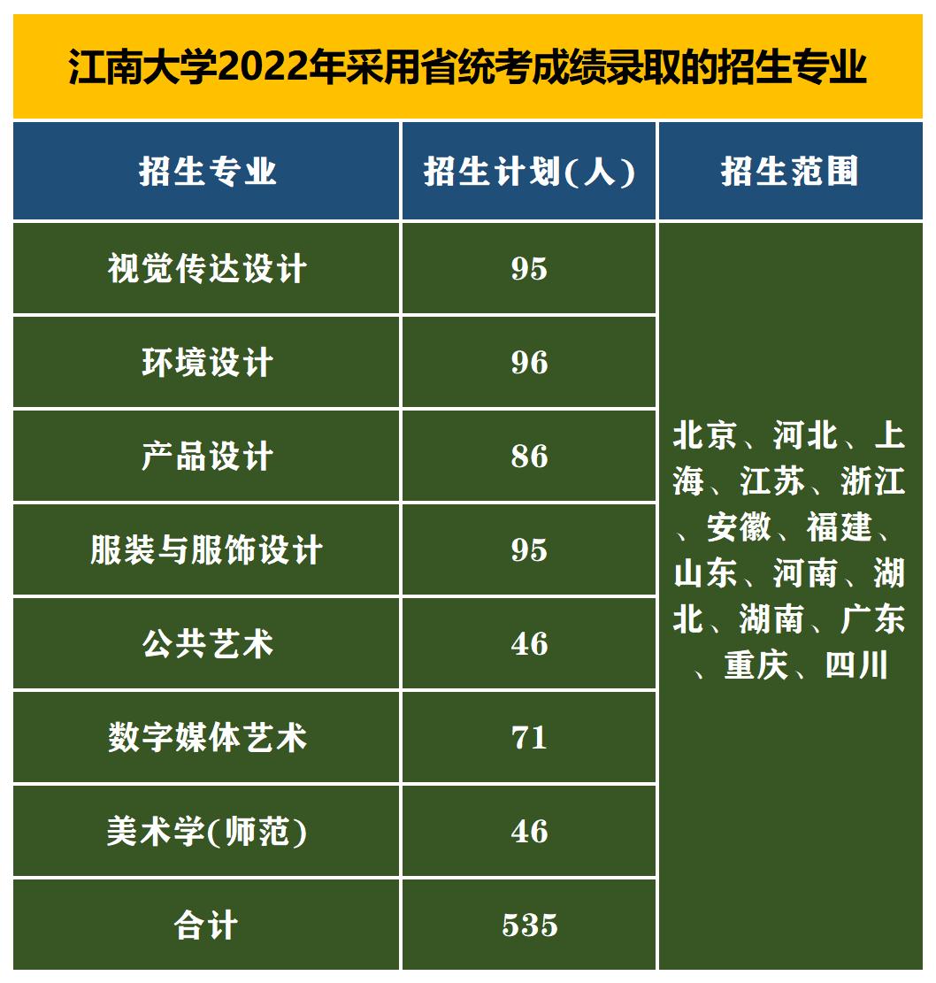2022年江南大学美术与设计类专业采取统考成绩录取,面向北京、河北、上海、江苏、浙江、安徽、福建、山东、河南、湖北、湖南、广东、重庆、四川等省招生535人,具体招生专业及计划见下表: