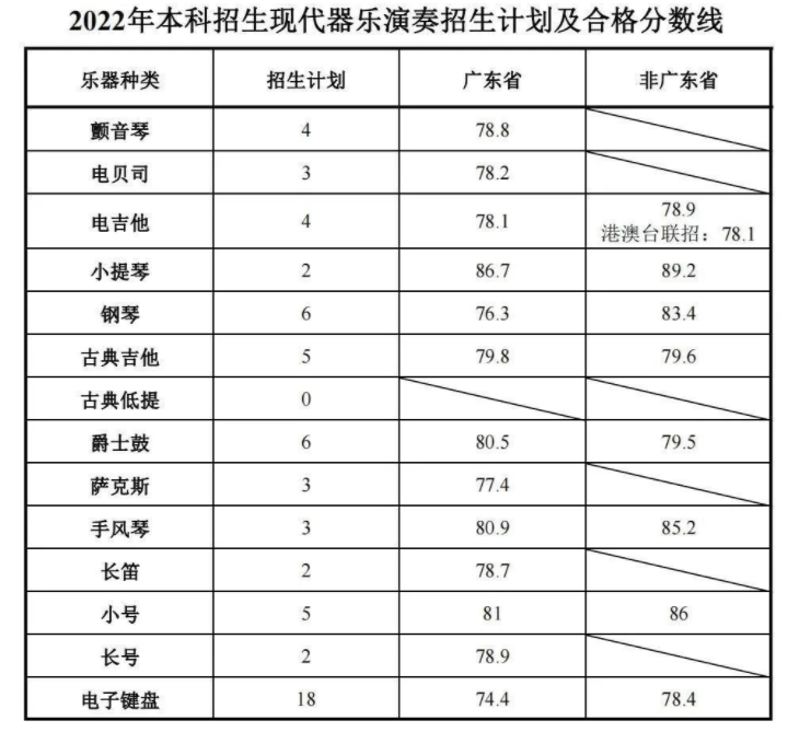 现代器乐演奏:2021年招生65人,2022年招生63人,减少2人,具体器乐种类招生计划如下图。