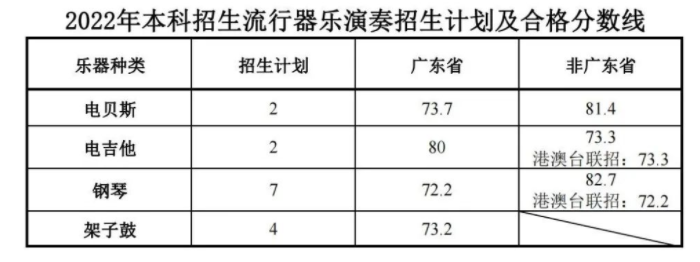 流行器乐演奏:2021年招生10人,2022年招生12人,增加2人,具体器乐种类招生计划如下如。