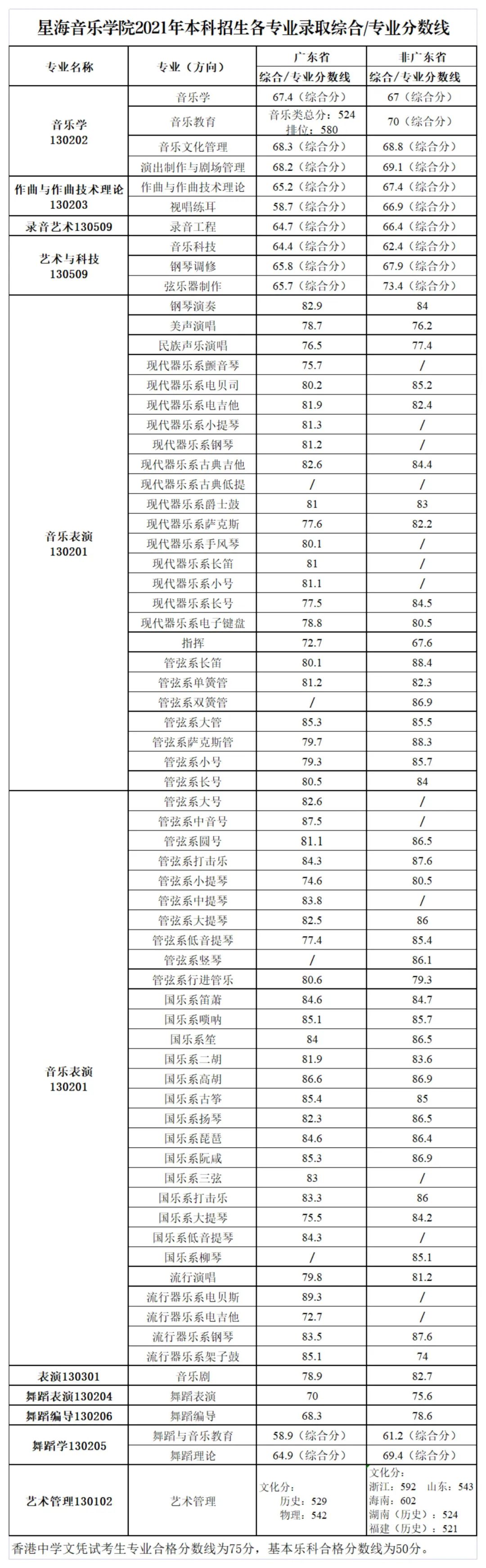 5.星海音乐学院2021年本科招生各专业录取综合/专业分数线