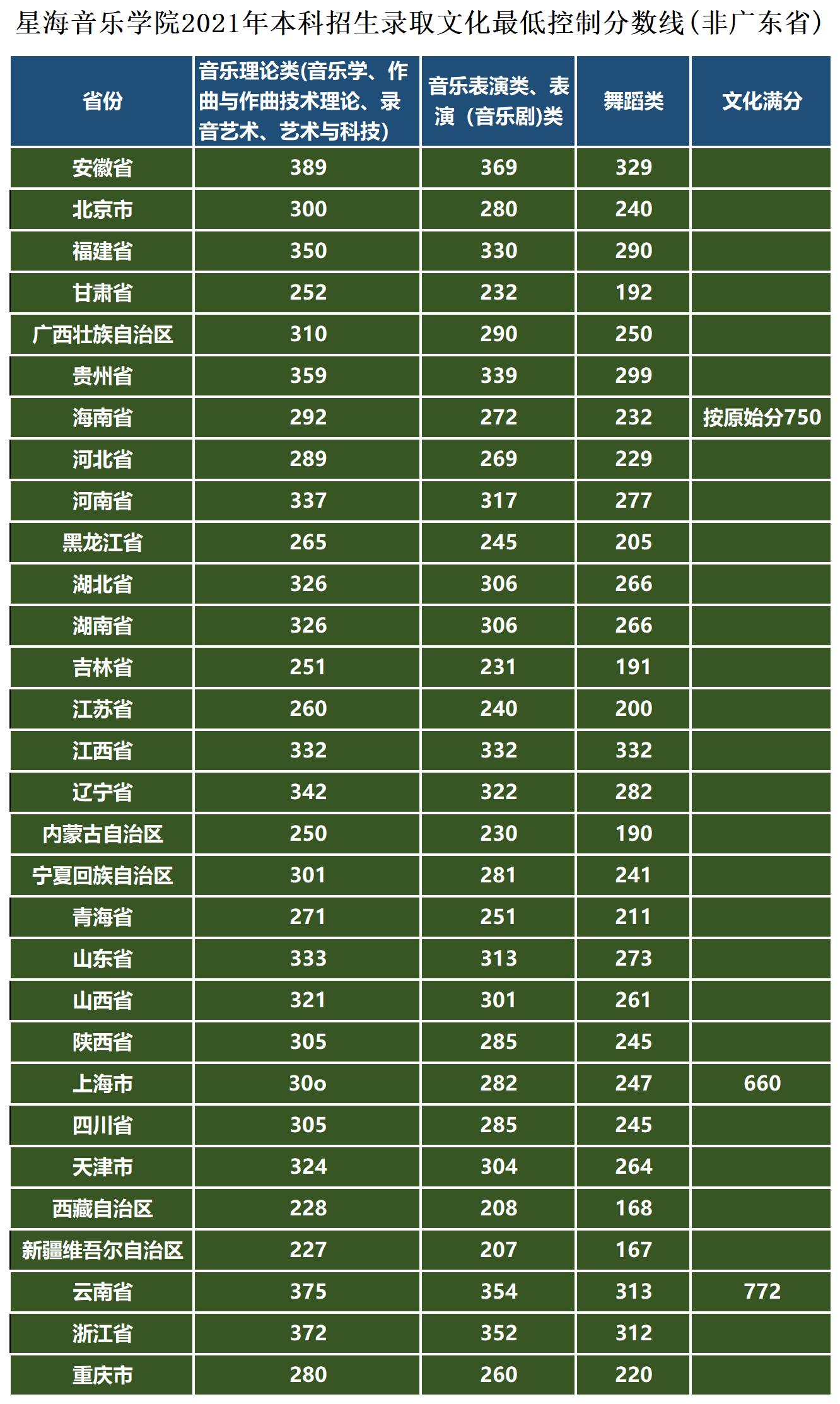 6.星海音乐学院2021年本科录取文化最低控制分数线