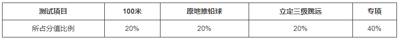 身体素质考试项目:100米、原地推铅球和立定三级跳远三项。