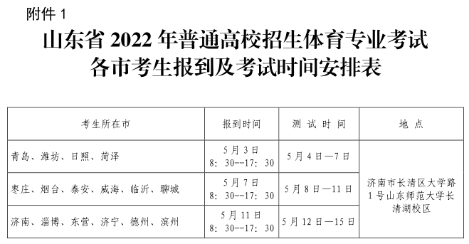 附件:1.山东省 2022 年普通高校招生体育专业考试各市考
