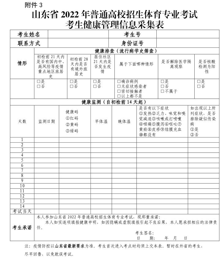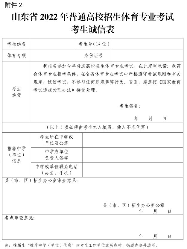 2.山东省 2022 年普通高校招生体育专业考试考生诚