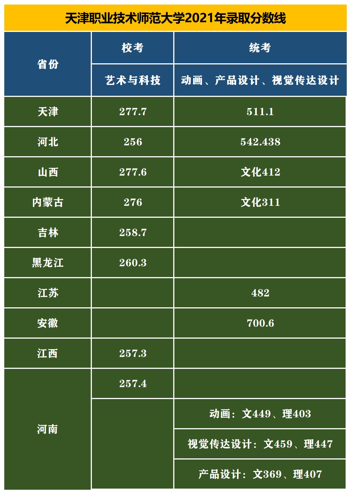 天津职业技术师范大学2021年艺术类专业录取最低分数参考线见下表: