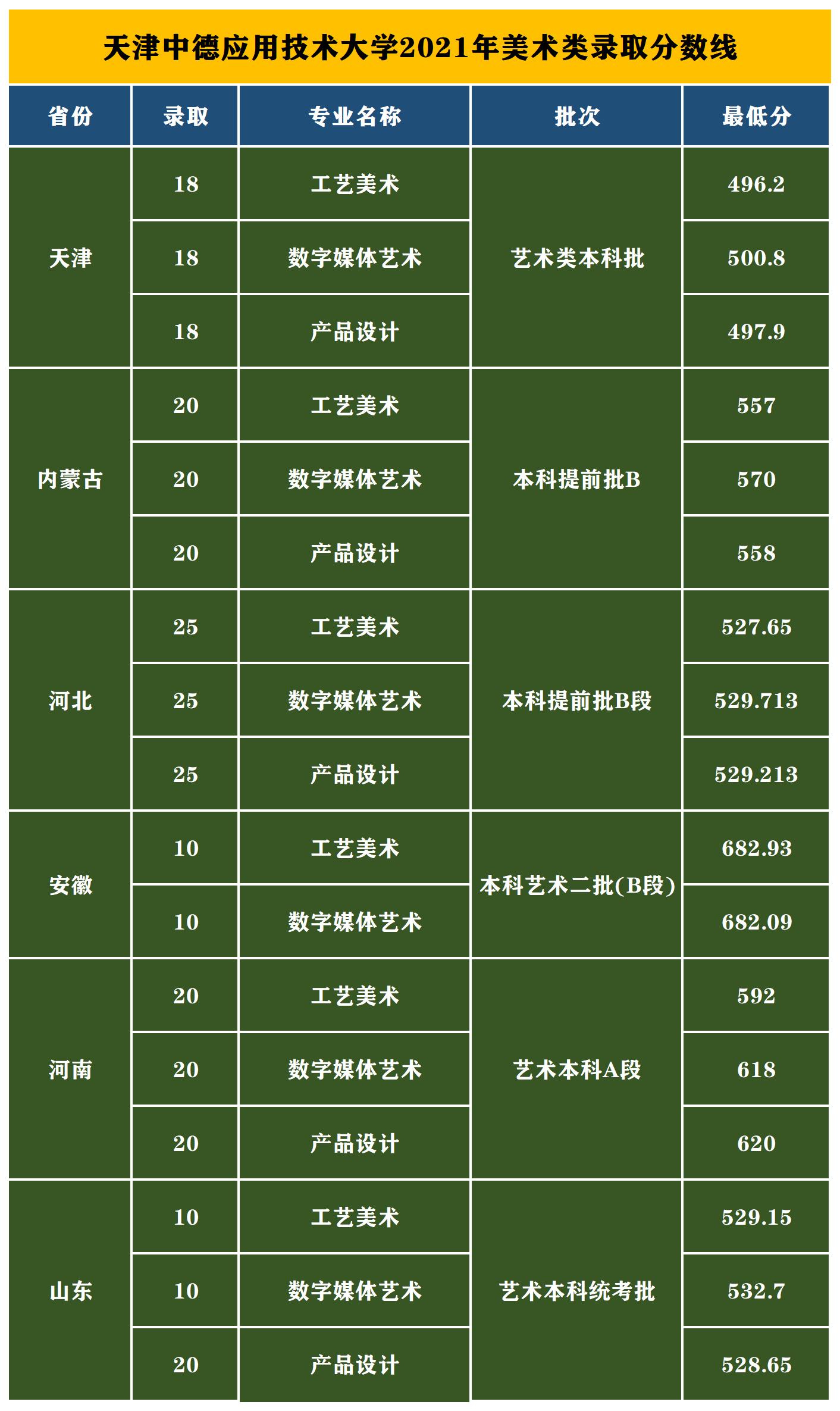 天津中德应用技术大学2021年设计学类专业各省录取分数参考线见下表: