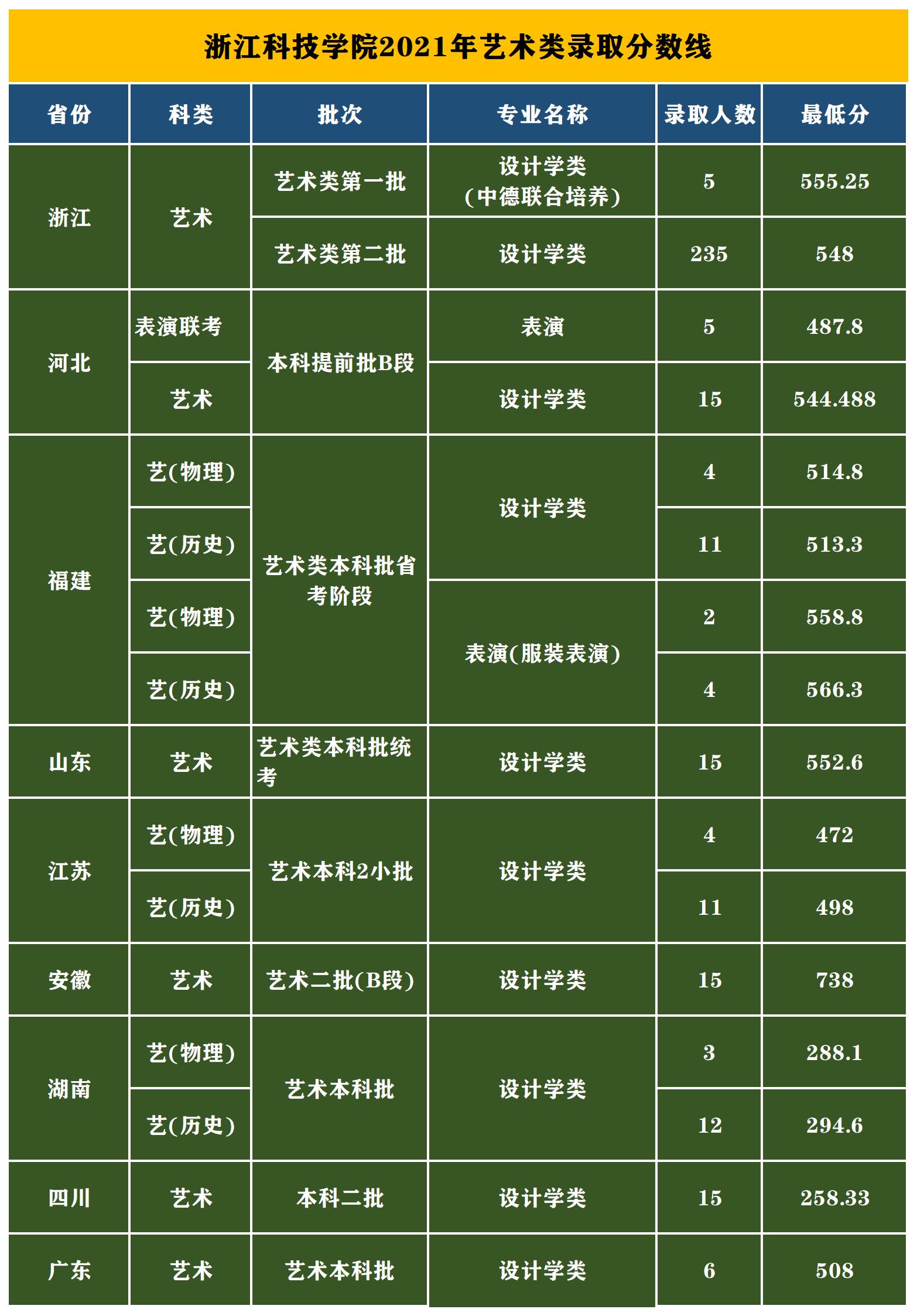 浙江科技学院2021年艺术类录取分数参考线见下表: