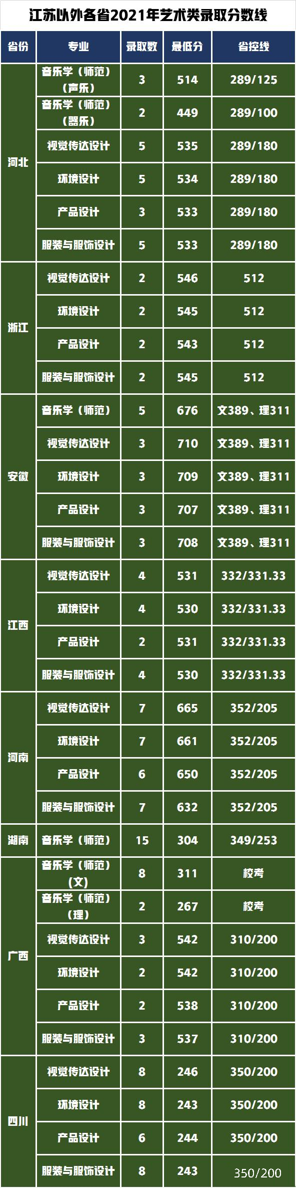 附常熟理工学院2021年江苏省以外艺术类专业录取最低分数线见下表: