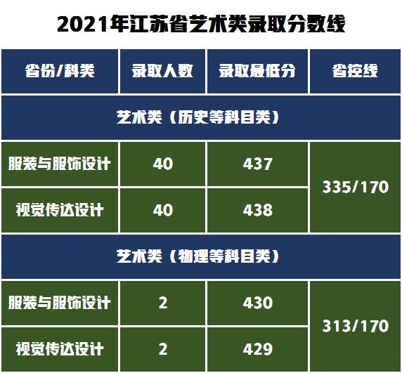 艺术类专业仅面向江苏省招生,承认江苏省美术统考成绩,招生的专业为视觉传达设计和服装与服饰设计,历史组录取80人,物理组录取4人,按照江苏省综合分成绩排序择优录取。