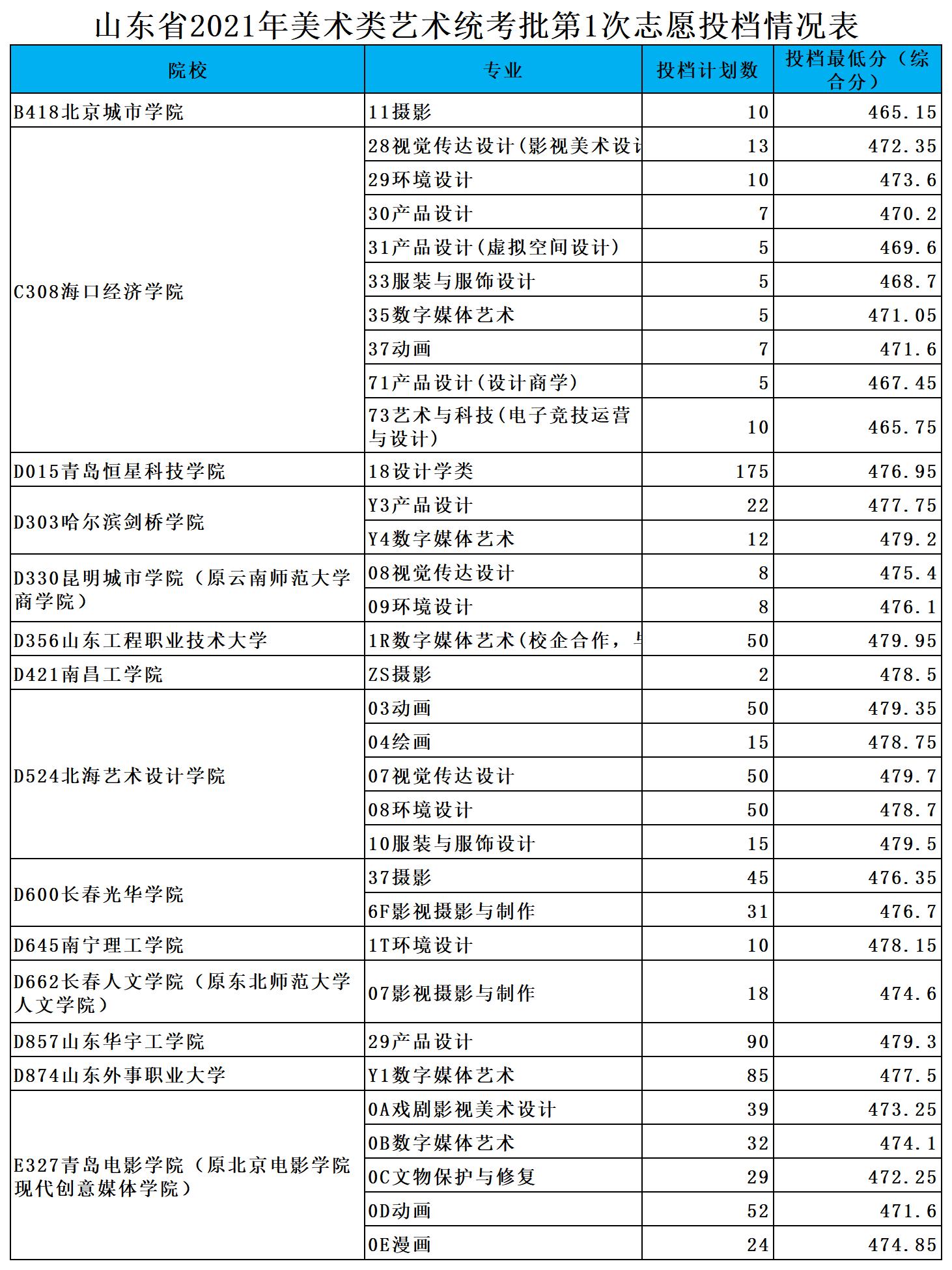 一、山东省美术类艺术统考批第1次志愿投档最低分数线