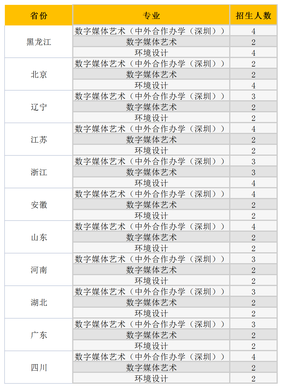 2022年6月14日官网发布了《哈尔滨工业大学2022年艺术类招生简章》,简章中明确了从2022年起依托“建筑学院环境设计专业和数字媒体艺术专业恢复招收艺术类考生”;2022年深圳国际设计学院启动本科招生,数字媒体艺术(中外合作办学)专业招收艺术类考生。