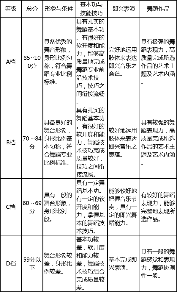 考查考生的舞蹈思维反应能力、动作协调能力、情感表达能力、音乐理解能力和舞蹈创编能力。播放音乐15秒后,考生进行舞蹈即兴表演。