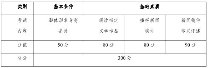报新闻稿件、即兴评述等 4 个部分,总分共计 300 分,各科目及