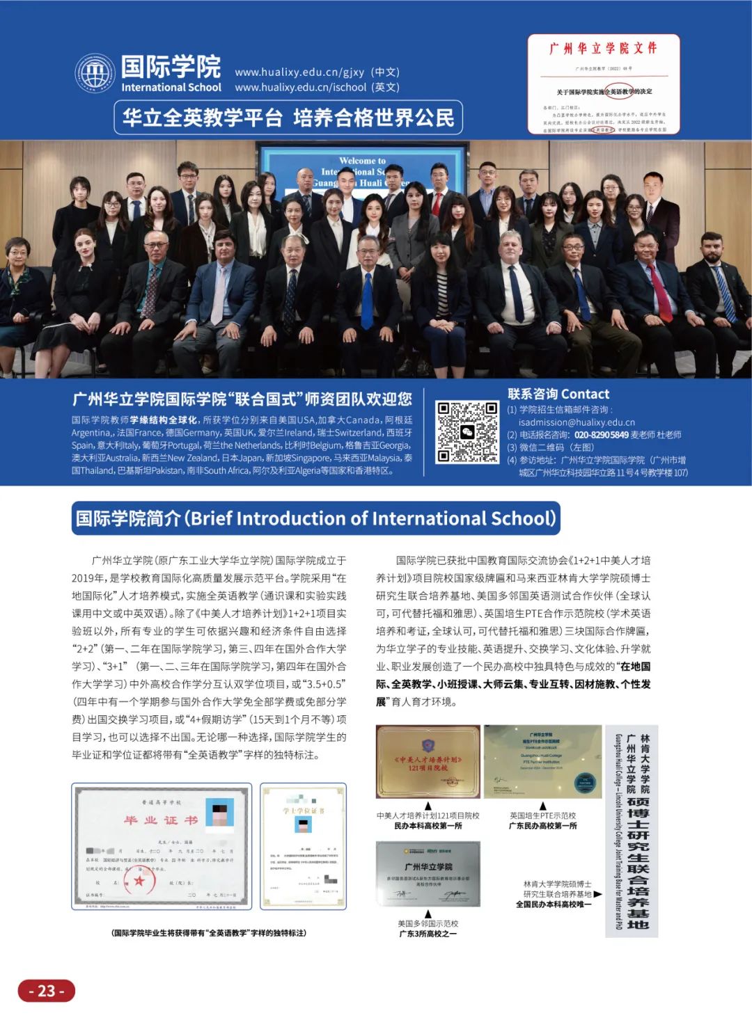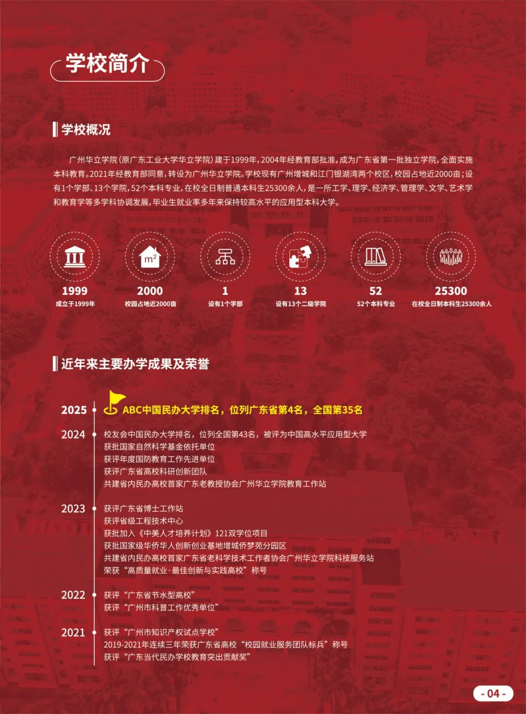 广州华立学院(原广东工业大学华立学院)建于1999年,2004年经教育部批准,成为广东省第一批独立学院,全面实施本科教育。2021年经教育部同意,转设为广州华立学院。学校现有广州增城和江门银湖湾两个校区,校园占地近2000亩;设有1个学部、13个学院,52个本科专业,在校全日制普通本科生25300余人,是一所工学、理学、经济学、管理学、文学、艺术学和教育学等多学科协调发展,毕业生就业率多年来保持较高水平的应用型本科大学。