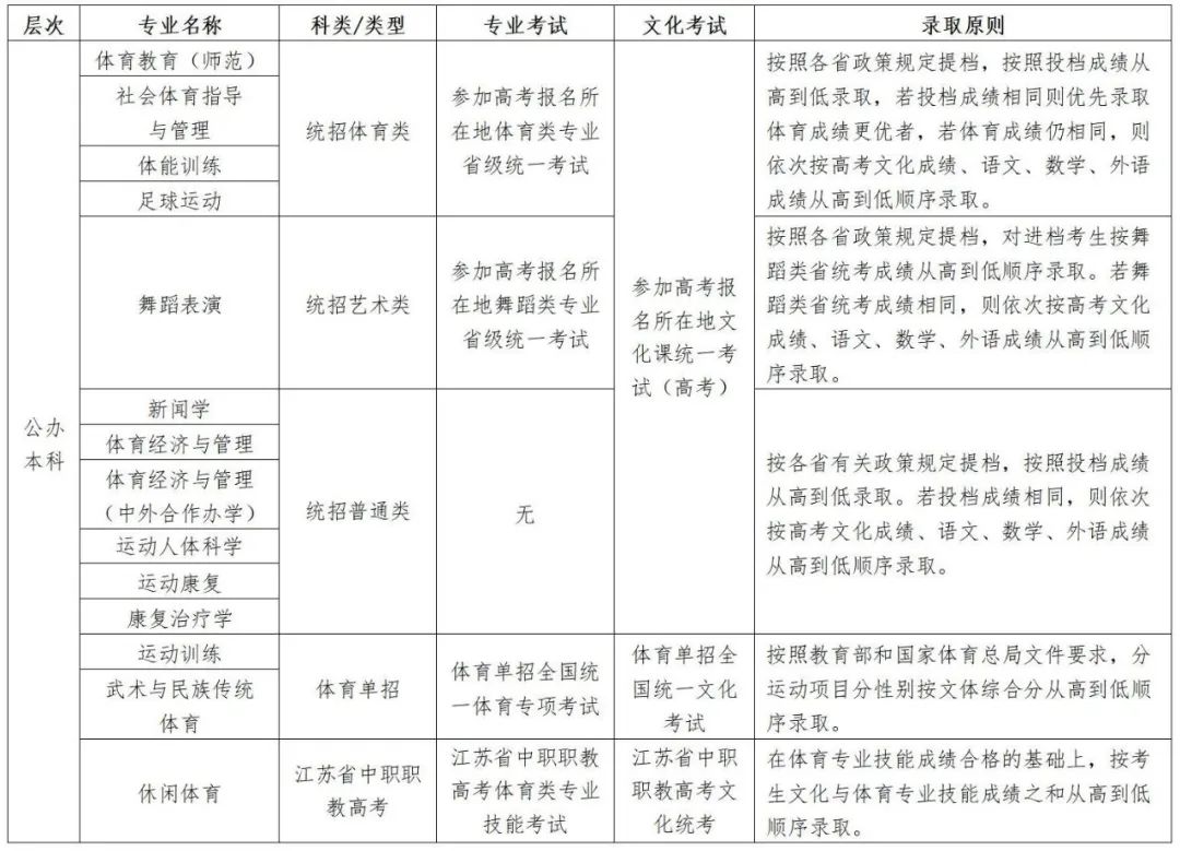 学校现设有体育教育与人文学院、运动训练学院、运动健康学院、体育休闲与产业学院、武术与艺术学院、马克思主义学院等6个高等教育学院。开设有16个本科专业,涉及教育学、文学、管理学、医学、艺术学5个学科门类,拥有体育学一级学科硕士学位授权点和体育、教育、新闻与传播3个硕士专业学位授权点,各类在校生5500余人。连续四期获批江苏高校优势学科建设工程立项单位。拥有国家级一流本科专业5个,江苏高校一流本科专业12个,江苏省产教融合型品牌专业建设点2个,国家级一流本科课程2门,省级一流本科课程18门,省优秀研究生课程5门。获得国家级高等教育教学成果奖3项,省级高等教育教学成果特等奖1项、一等奖6项、二等奖5项,国家体育总局教育教学成果奖二等奖3项、三等奖5项,江苏高校省级优秀基层教学组织1个。建有江苏省高等学校基础课实验教学示范中心建设点1个,省级实验教学与实践教育中心3个,实习实训基地102家,省级产教融合重点基地建设点1个。学生荣获全国高校体育教育专业大学生基本功大赛团体一等奖、“挑战杯”全国大学生创业计划竞赛金奖等。