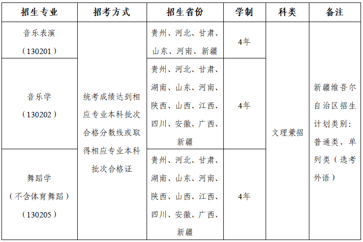 (三)所有考生必须参加全国普通高考文化课统一考试,方可填报我校音乐类、舞蹈类(不含体育舞蹈)专业志愿。所报专业有相应省(自治区、直辖市)级统考的,考生须参加生源所在省(自治区、直辖市)组织的专业统考。