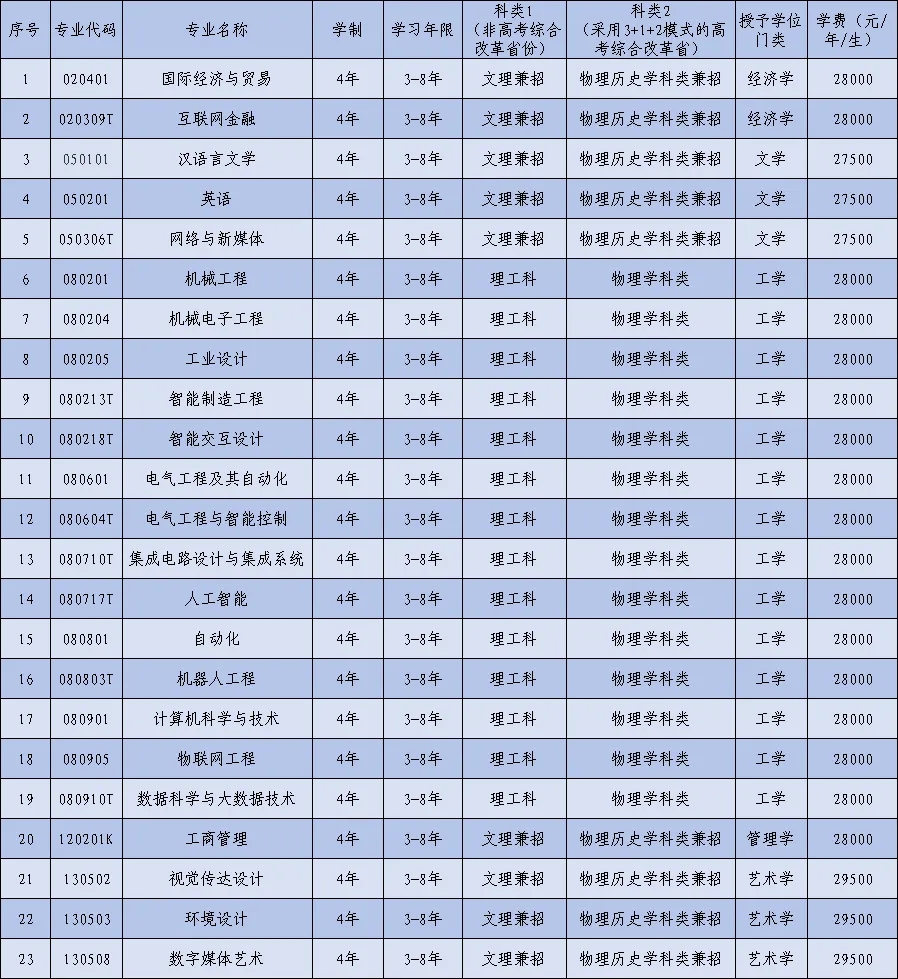 艺术类专业学费为29500元/生/学年;普通类中工学、管理学、经济学、教育学类专业学费为28000元/生/学年,文学类专业学费为27500元/生/学年。