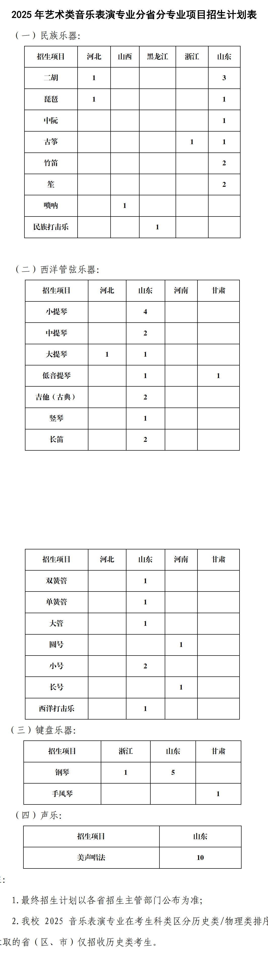 我校音乐表演专业2025年拟面向河北、山西、黑龙江、浙江、山东、河南、甘肃7个省份招生55人,具体分省分专业项目招生计划详见附件。
