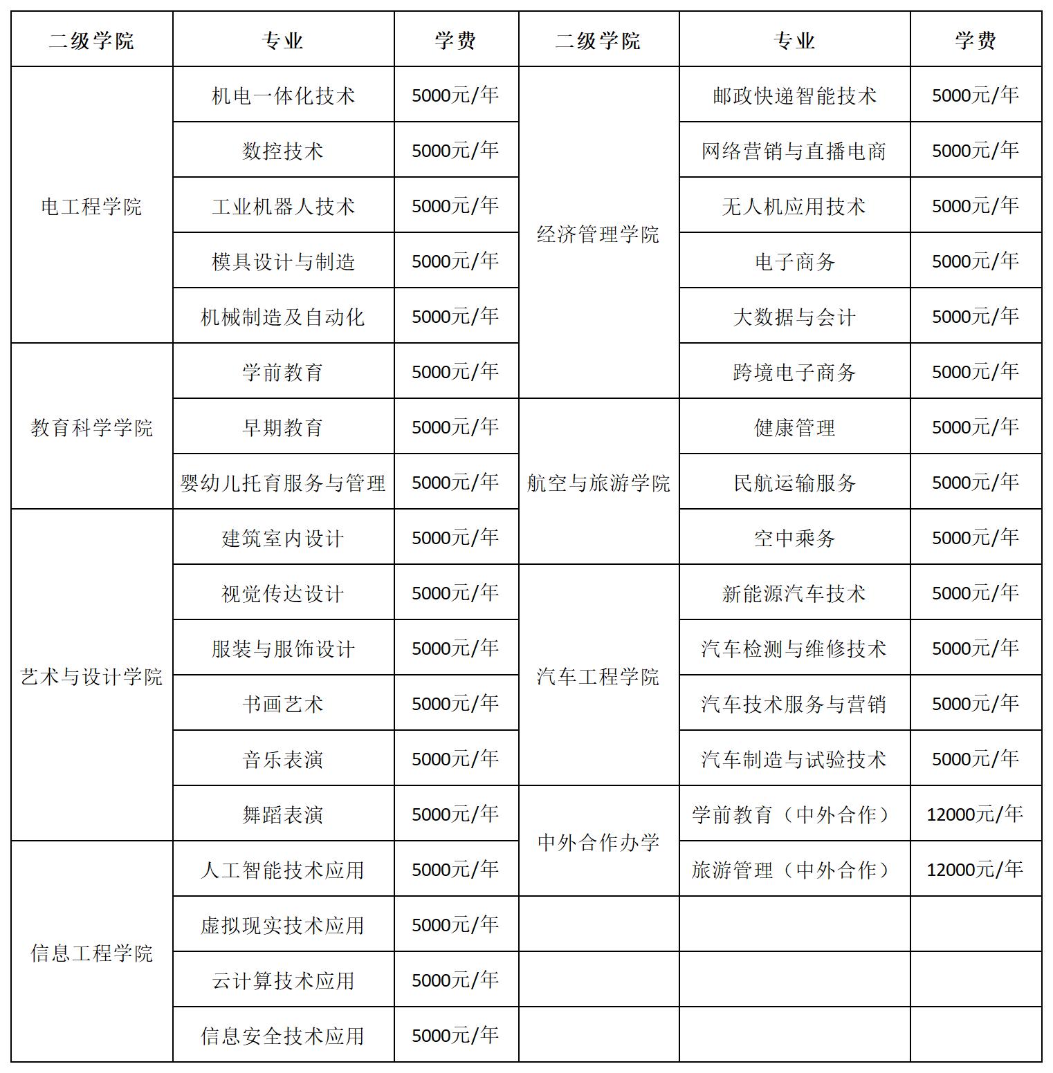 收费标准:学费5000元/年,住宿费800元/年。中外合作办学专业收费标准:学费12000元/年,住宿费800元/年。如有调整,按省级人民政府批准的学费标准执行。