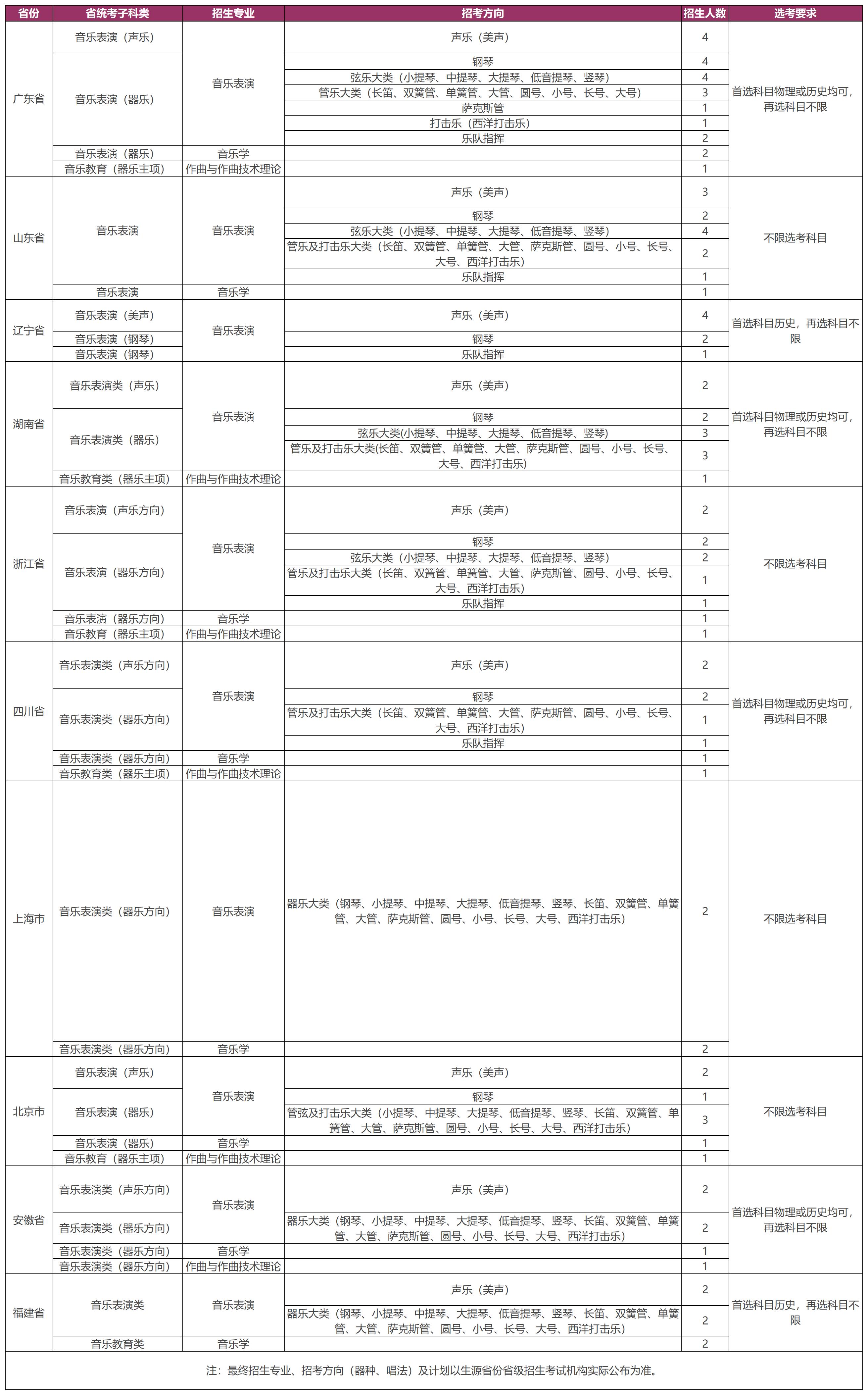 2025年音乐学院拟在广东省、山东省、辽宁省、湖南省、浙江省、四川省、上海市、北京市、安徽省、福建省招收音乐类本科生。省统考子科类、招生专业、招考方向、招生人数、选考要求等内容如下: