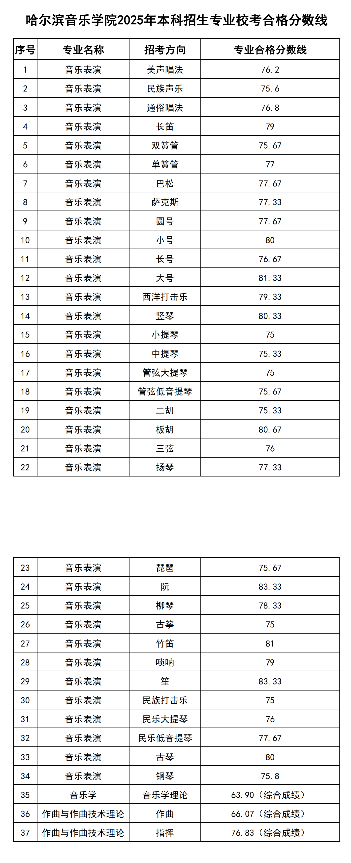 根据《哈尔滨音乐学院2025年本科招生简章》要求,按照学校2025年本科专业校考相关规定,现将我校2025年本科招生专业校考合格分数线及合格考生名单公布如下(见附件1、2)。