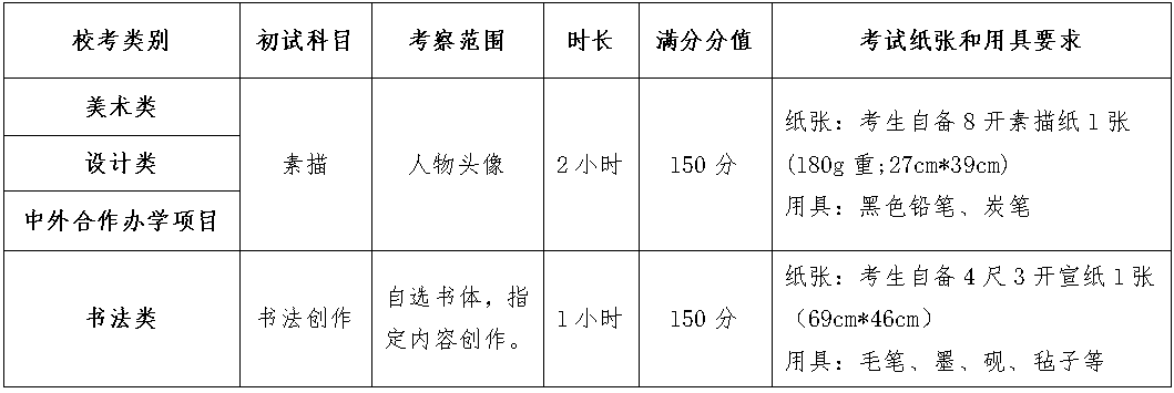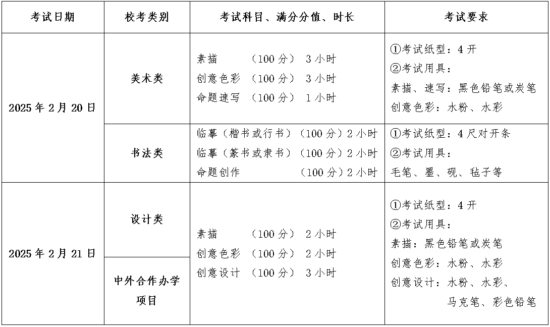 我校2025年艺术类校考专业按“网络初试+现场复试”的模式组织考试,校考类别分美术类、设计类、中外合作办学项目、书法类,按校考类别发放校考合格证,按专业录取。各校考类别包含专业和省级统考科类要求详见下表: