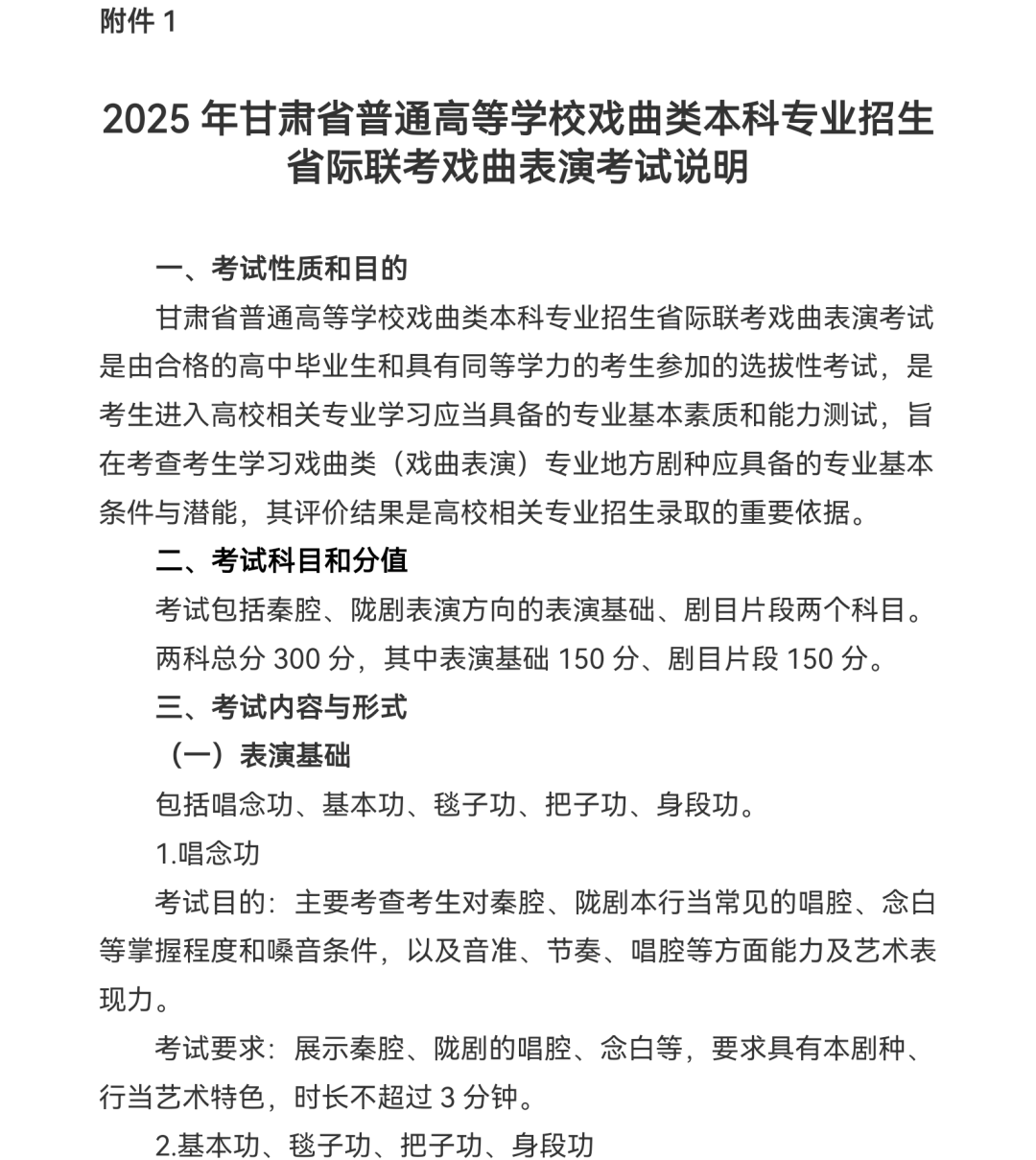 1:2025年甘肃省普通高等学校戏曲类本科专业招生省际联考戏曲表演考试说明
