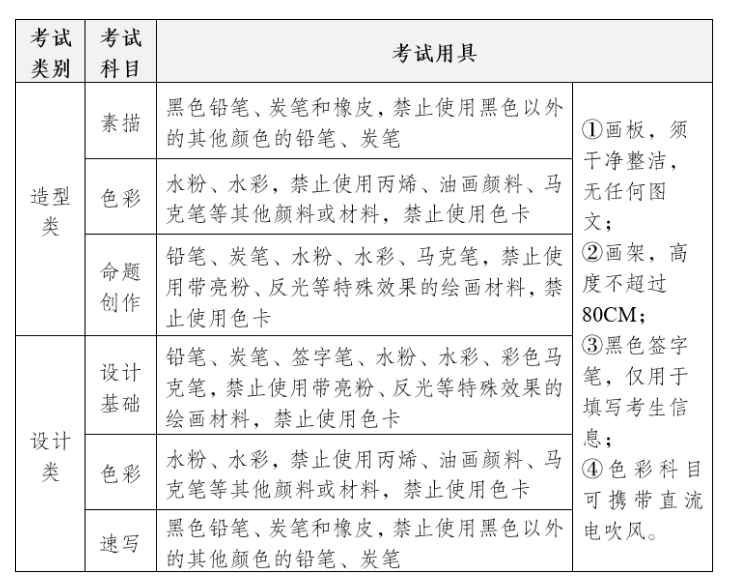 ①铅笔、炭笔、水粉、水彩、马克笔,禁止使用带亮粉、反光等特殊效果的绘画材料,禁止使用色卡;