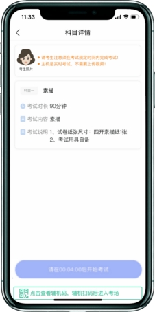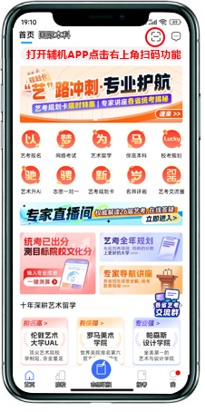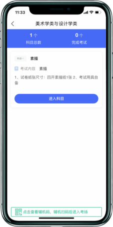 考生主机登录“艺术升”APP选择报考栏目,点击“网络考试”菜单,选择中国美术学院2026年本科招生(模拟考试)。待主机显示二维码后,用辅机打开“艺术升”APP(注意:辅机只打开“艺术升”主页,不要登录账号,使用首页右上角扫描工具“[-]”),扫码成功后辅机进入网络考试考场。只有辅机进入考场后,主机方可进入科目列表按系统提示进入该场考试。