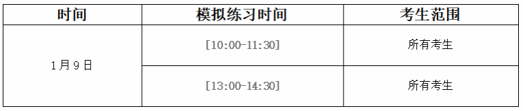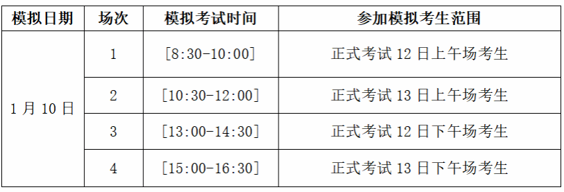 所有考生须在1月10日参加模拟考试,模拟考试的场次和时间不能随意变更,模拟考试将安排监考员在线监考。若因未参加模拟考试,后期无法正常参加考试的一切后果由考生自行负责。