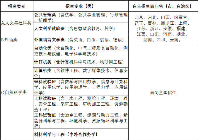 自然科学类限理工类考生报考,人文与社科类、外语类限文史类考生报考。外国语言文学类(含英语、日语、俄语、德语)、计算机类(含软件工程、数字媒体技术、信息安全)限外语语种为英语的考生报考。考生可选择自然科学类、人文与社科类、外语类其中一类报名,不得兼报。