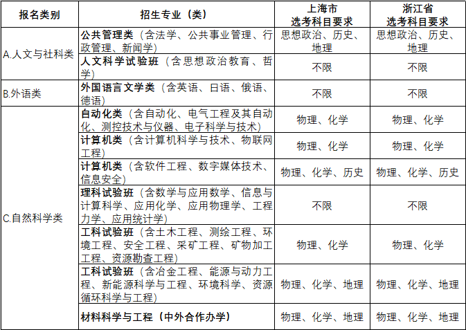 东北大学2019年自主招生专业(类)在上海市、浙江省选考科目范围要求