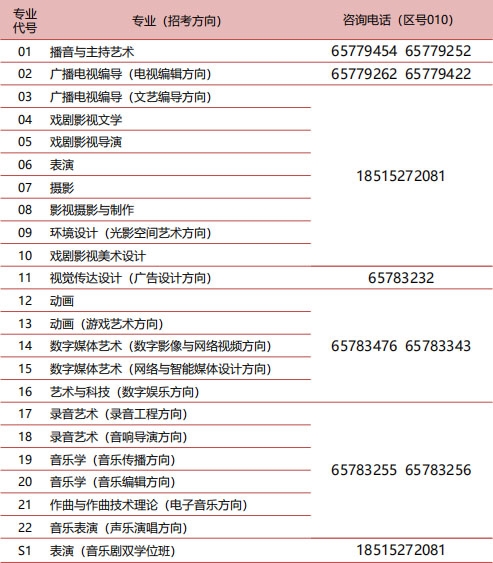 戏剧影视美术设计、视觉传达设计(广告设计方向)、动画、动画(游戏艺术方向)、音乐学(音乐传播方向)、音乐学(音乐编辑方向)、作曲与作曲技术理论(电子音乐方向)、音乐表演(声乐演唱方向)。