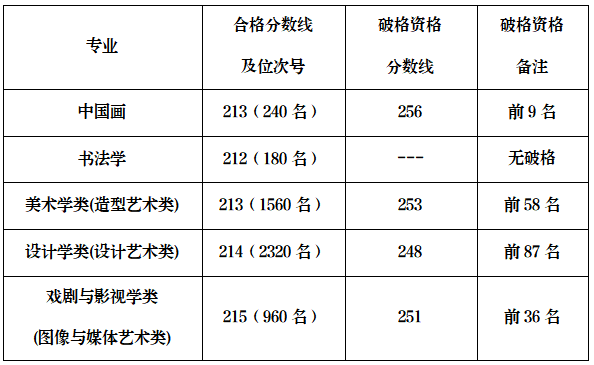 3、破格录取范围仅适用于部分组织校考的艺术类(校考)专业(类),含中国画、美术学类、设计学类、戏剧与影视学类。若上述专业(类)满足条件的录取人数未达到招生计划数,经学校研究后启用破格录取。