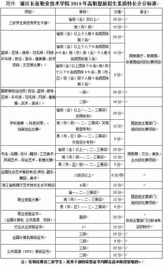 1.高中阶段具有素质特长,符合条件的考生可获得素质特长计分(具体办法见附件《浙江长征职业技术学院2019年素质特长计分标准》),同一考生如符合多项计分条件的,同类项计分只取高分项;不同类项可累计计分,但累计分值最高不超过20分。