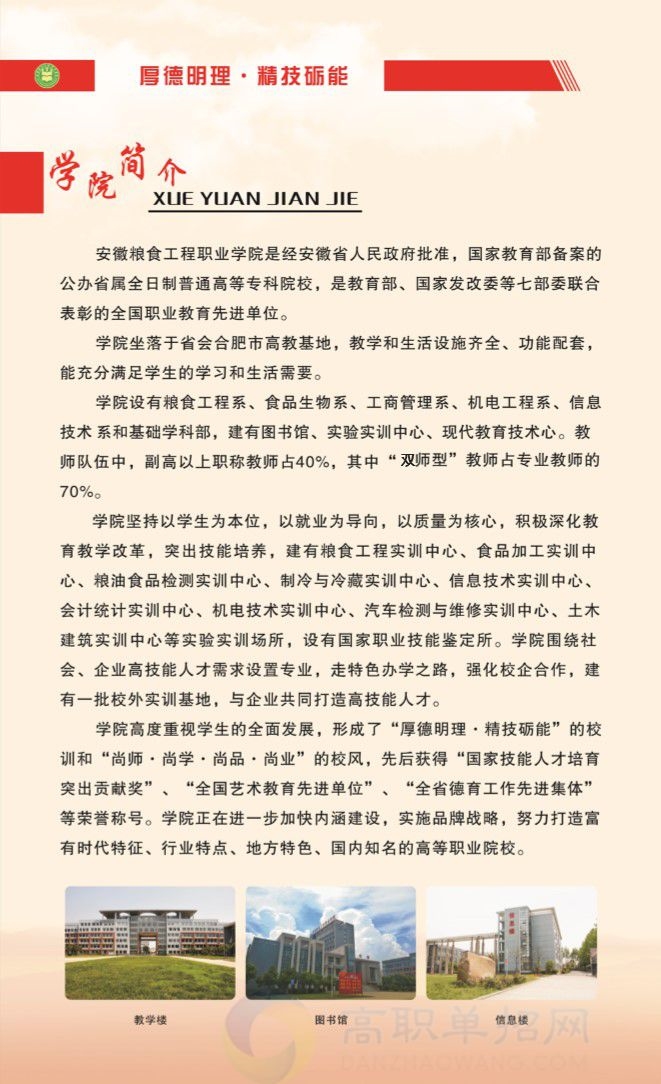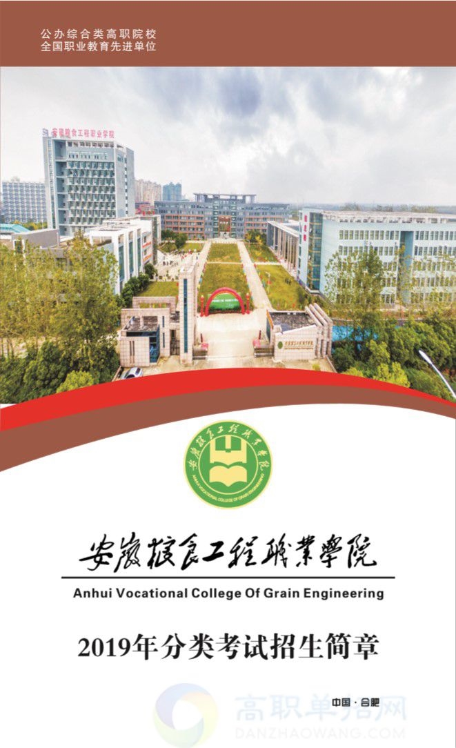 安徽粮食工程职业学院原名安徽省合肥粮食学校,始建于1964年,隶属于安徽省粮食局。2007年5月,省政府批准成立以高技能人才培养为主的安徽商贸工程技师学院。2012年3月,安徽省人民政府正式批准设立安徽粮食工程职业学院,由此步入了高等职业院校的行列,成为全国唯一一所以粮食命名、行业主管的高等院校。学院位于合肥市高教基地,占地340亩,总建筑面积约12万平方米。