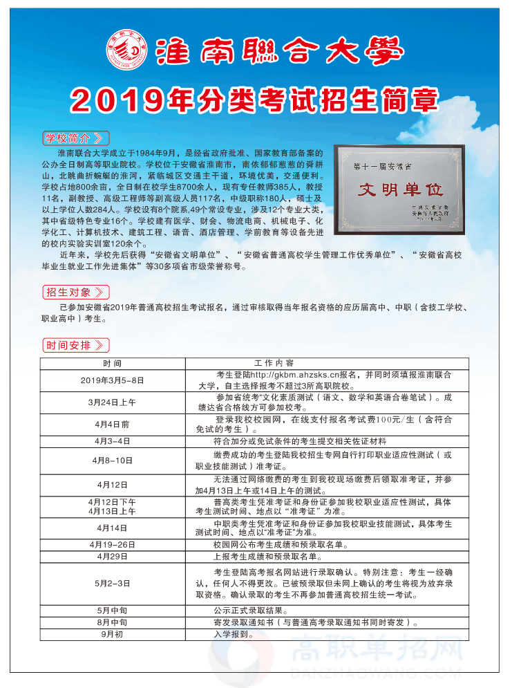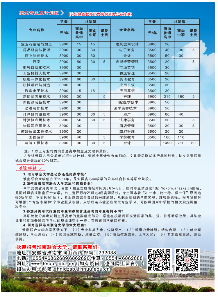 淮南联合大学成立于1984年9月,是经省政府批准、国家教育部备案的普通高等专科学校。学校位于中国较大城市安徽省淮南市,南依郁郁葱葱的舜耕山,北眺曲折蜿蜒的淮河,紧临城区交通主干道,环境优美,交通便利。办学34年来,学校办学规模不断扩大、教学质量稳步提高、办学特色逐年彰显、社会声誉日益提升。