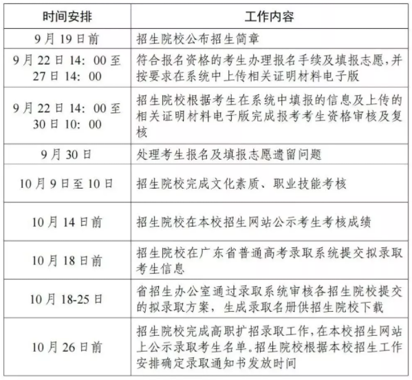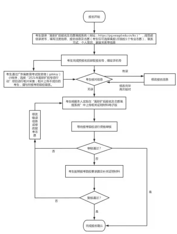 1.考生登录广东省高职扩招报名及志愿填报系统(https://pg.eeagd.edu.cn/ks),根据系统指引阅签诚信承诺书,填写注册信息、报名信息及志愿信息、联系方式、个人简历、家庭关系等信息,获取报名号、绑定手机号,通过微信小程序采集相片并经核对信息无误后根据实际按照要求上传相关证明材料电子版。高职扩招报名及志愿填报工作全部在网上进行,时间为9月22日14:00至9月27日14:00,逾期不再办理相关手续,考生不得再修改已填报个人信息及院校专业志愿。相片上传不成功的考生,请与所报考的院校联系。