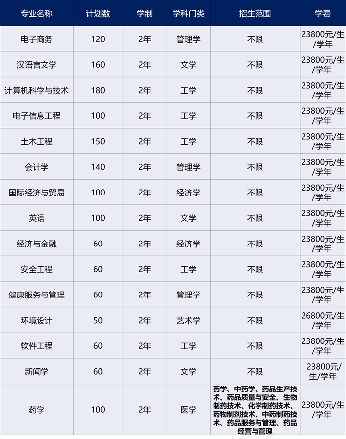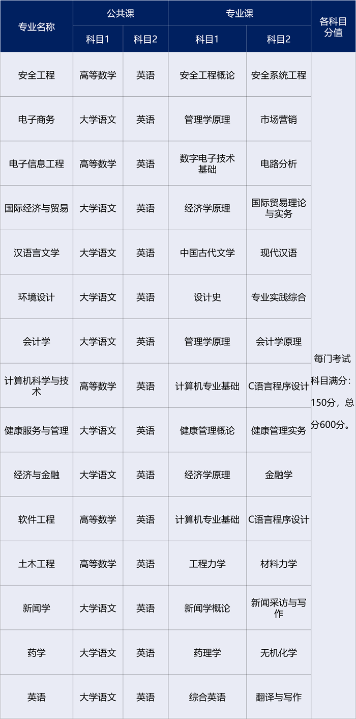 说明:考试实行“2门公共课(各150分)+2门专业课(各150分)”的入学测试方式,其中公共科目由省考试院组织进行统考;专业科目由我校自主命题或开展联合命题,并组织考试。