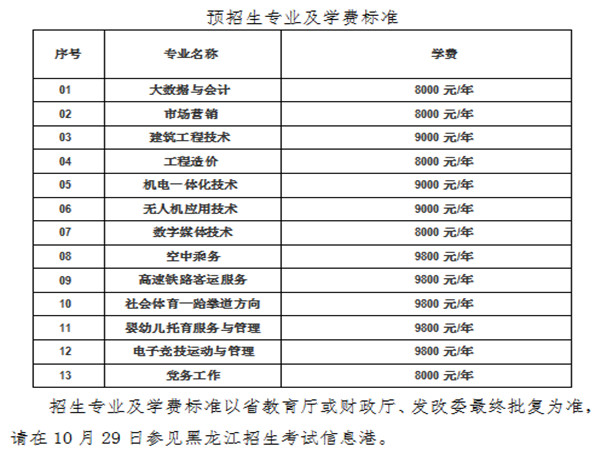 招生计划:招生计划以省招生考试院发布为准,请在10月29日参见黑龙江招生考试信息港。