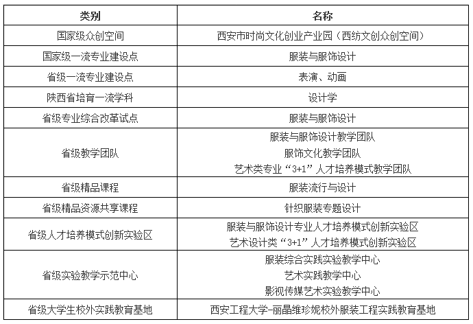 学校现有国家级众创空间、国家级一流专业建设点、省级一流专业建设点、省级培育一流学科、省级一流专业、省级教学团队、省级精品课程、省级精品资源共享课程、省级人才培养模式创新实验区、省级实验教学示范中心和省级大学生校外实践教育基地,已成为西部最有影响力,集政、产、学、研、用为一体的特色学科专业群,详见下表: