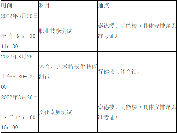 所有考生都必须参加我校组织的职业技能测试、心理测试。应届普通高中考生有2021年学考成绩的考生不参加文化素质测试,退役军人考生免予文化素质测试,其他考生必须参加我校组织的文化素质测试。