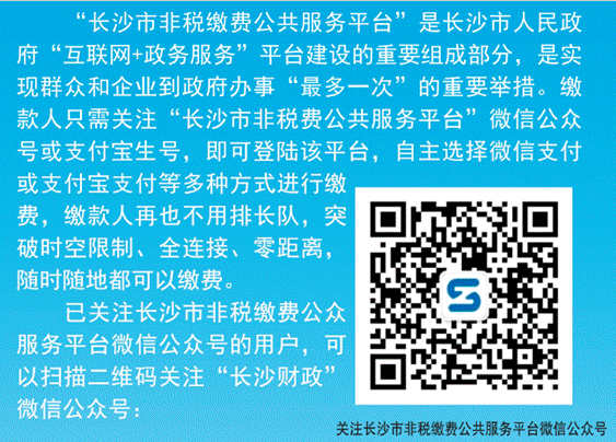 扫描上方二维码进入长沙市非税缴费公共服务平台微信公众号——点击“政务大厅”选择“非税缴费”——进入缴费主页面点击“教育”——进入选择学校页面选择“长沙卫生职业学院”——选择缴费类别“学杂费”——进入缴费页面输入学生信息(学生姓名、11位缴费档案号)——进入缴费详情页面,核对缴费项目无误后点击“去缴款”——选择支付方式,点击“支付”——支付成功后点击“查看订单”查看订单详情,系统实时推送缴款通知给缴款人。