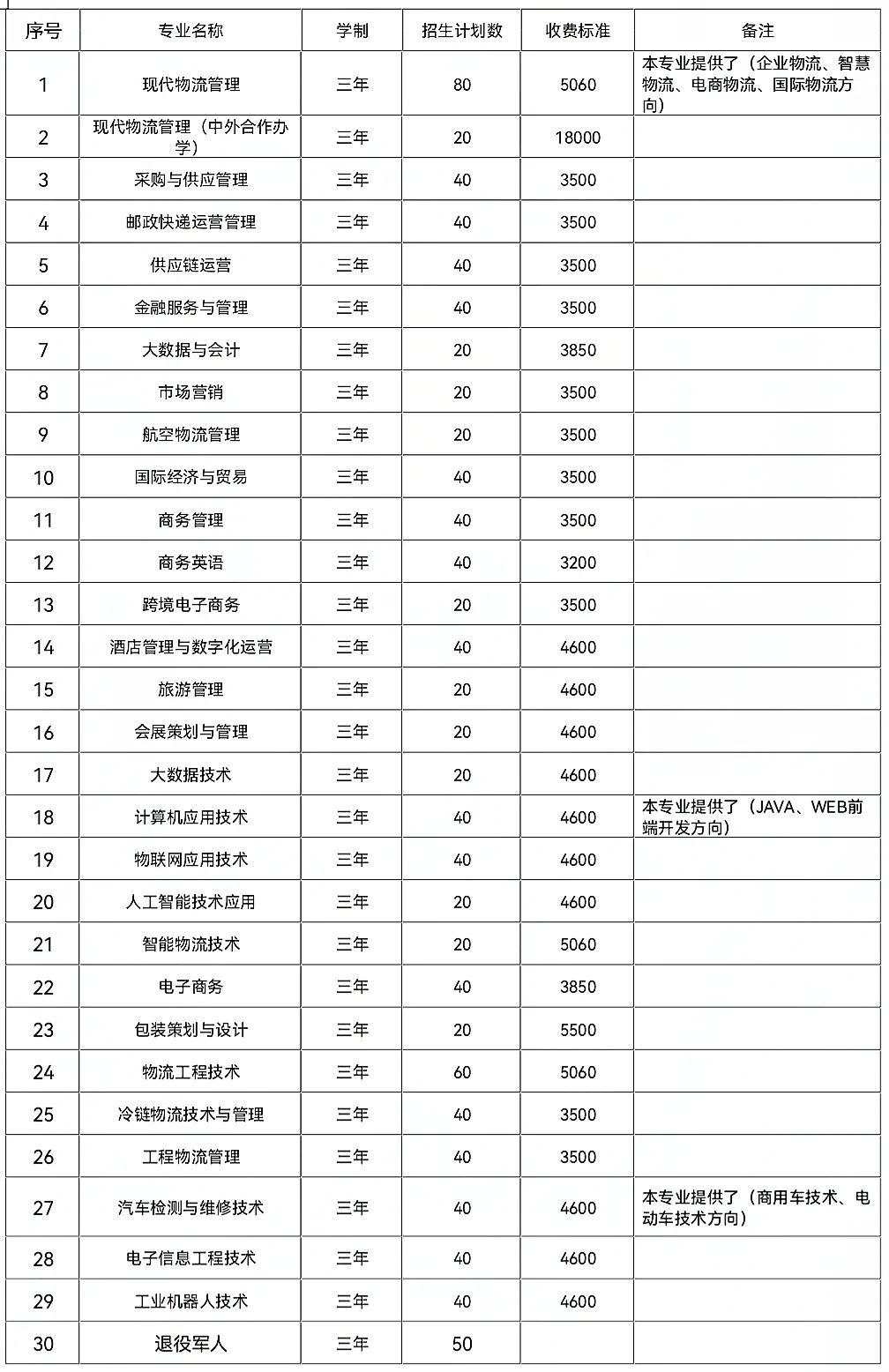 单招专业及招生计划