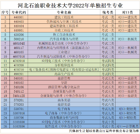 学校单独招生专业和招生计划详见省教育考试院公布的《2022年河北省普通高职院校单独考试招生计划》。