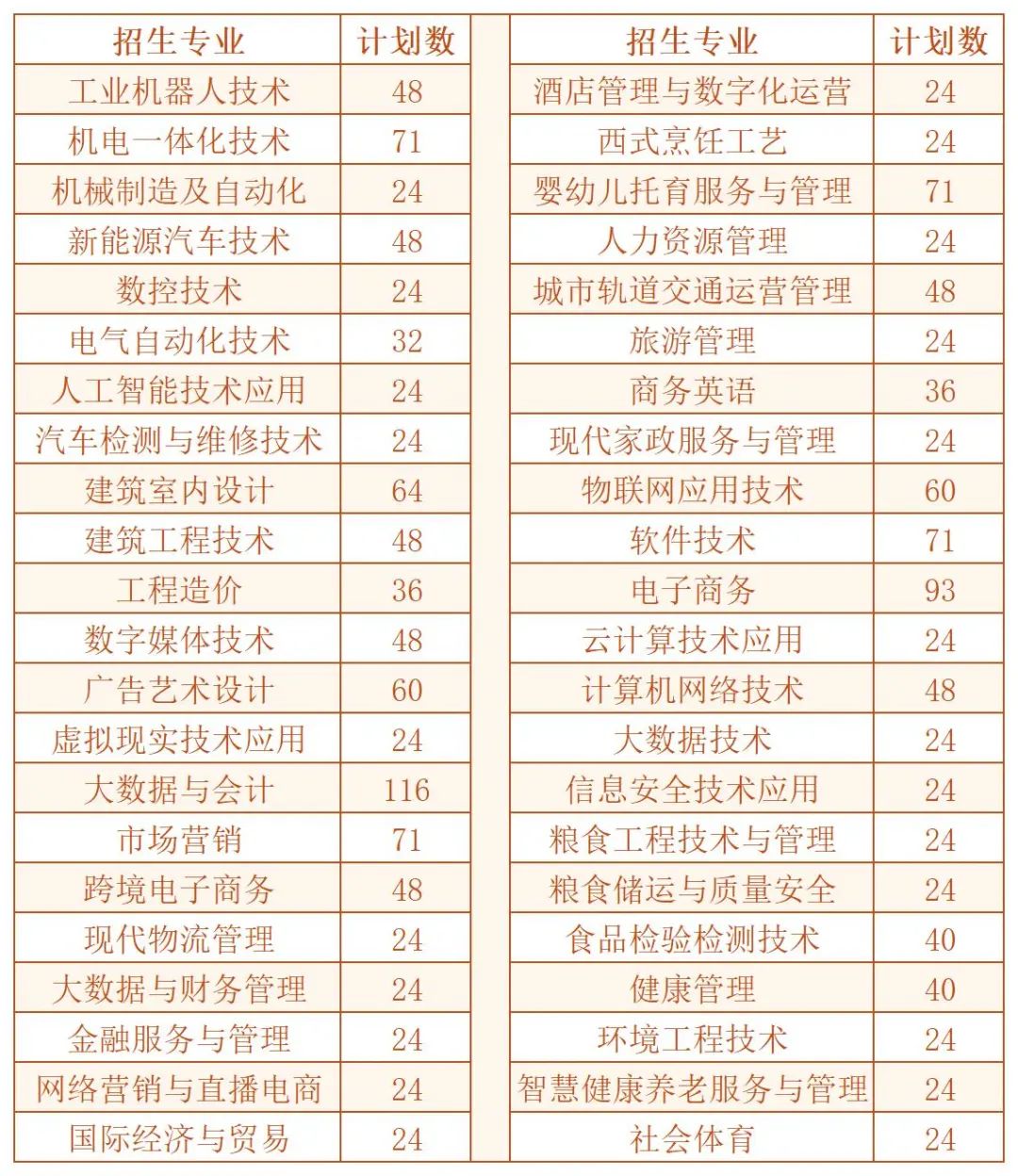 3.以上专业计划为学院2022年经省教育厅批准的最低单招计划,后期可能会因招生政策及学院实际报名情况有所增加,届时将根据各专业招生计划按比例增加,不会影响考生报考和学院单招录取原则。