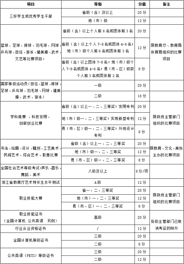 浙江长征职业技术学院2022年高职提前招生素质特长计分标准