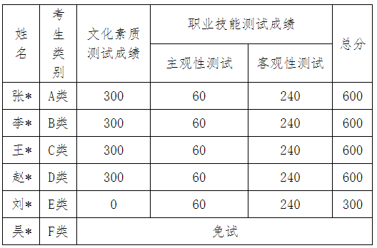 A类考生(应届普通高中考生):文化素质测试成绩(学业水平考试语、数、外三科成绩之和,满分300分)+职业技能测试成绩(面试+职业适应性测试),满分600分。