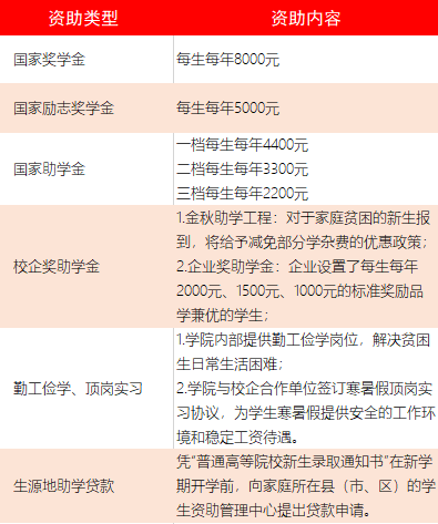 学院坚持公益办学,学费标准充分考虑高等职业教育面向对象的承担能力。此外学院还根据国家助学政策,提供了以下资助方式: